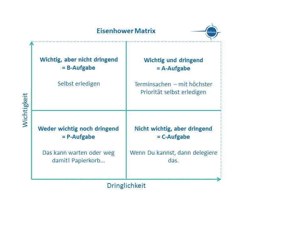 Der ehemalige US-Präsident Dwight D. Eisenhower gilt als Namensgeber dieser Methode. Sie basiert auf der Erkenntnis, dass wichtige Aufgaben nicht dringend sein müssen und dringende nicht unbedingt wichtig. Folglich sortiert man Aufgaben entsprechend ihrer Wichtigkeit und Dringlichkeit in 4 Kategorien und behandelt sie entsprechend: